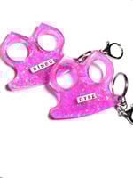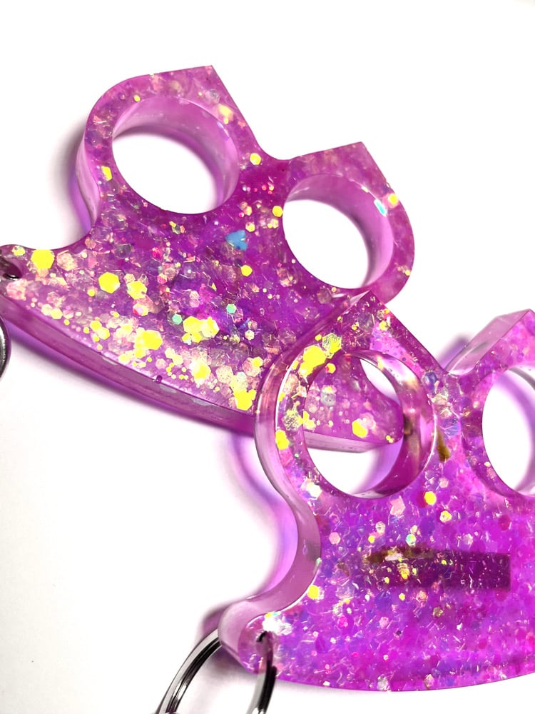 Hand poured extra hard resin self defense keychain. Glossy sparkly pink with handmade metal charms set inside. It is durable, compact and feels comfy in your hand. Look cute while feeling in your power!