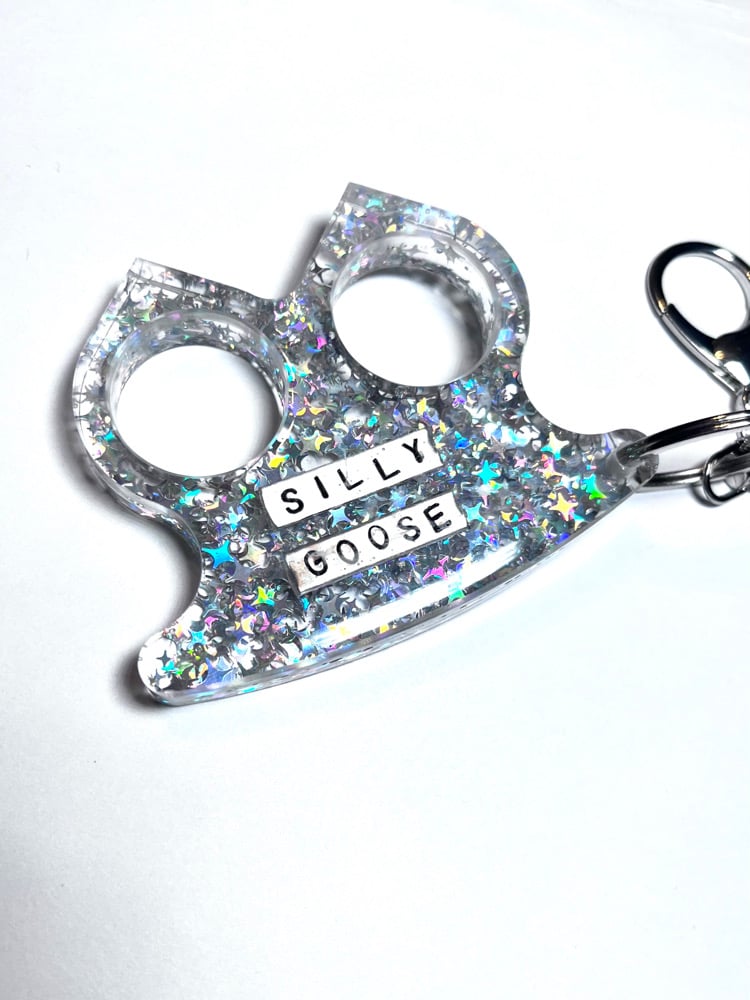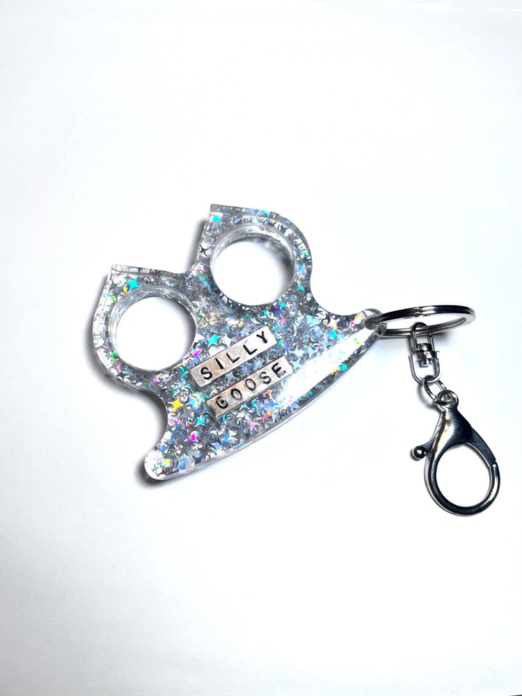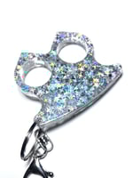 Hand poured, holographic silver sparkly resin self defense keychain with handmade metal charms set inside. Made out of a super hard, two part epoxy resin that is durable while feeling smooth and comfy in your hand. Look cute while feeling in your power. The lobster claw keychain is perfect for hanging off of your belt loop, keys, backpack or purse.