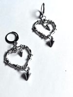 Delicate yet tough, detailed barbed wire shaped into a heart with mall cone spikes dripping from it. They are attached to a lever-back earring hook, a small hoop that clicks shut (great for people who lose earrings easily or folks with gauged ears.)